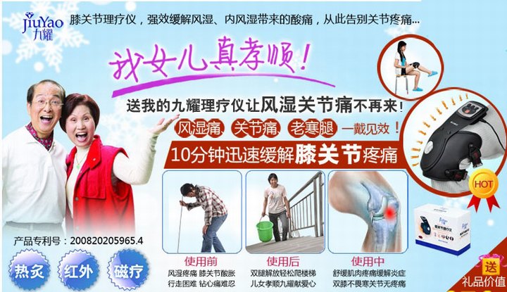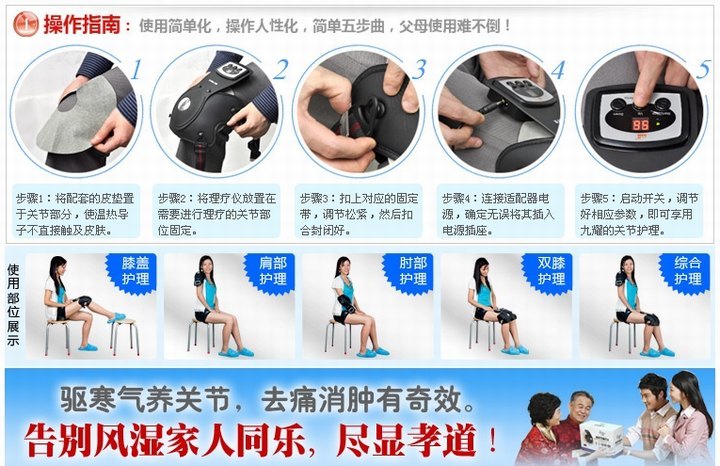 九耀膝关节理疗仪可通过迅速降低神经末梢的兴奋性,使微血管扩张,改善肌肉组织的通透性,抑制氧化,使患处立即减轻疼痛,炎症得以消散,关节不再肿痛。