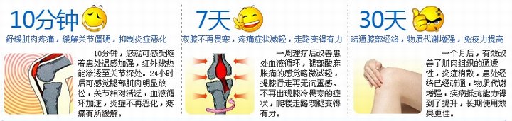在使用九耀膝关节理疗仪过程中红外线渗入体内,分子之间的热反应加速血液循环,清除了血管囤积有害物,将妨害新陈代谢的障碍完全扫除,打通了血液通道,使人体恢复正常。